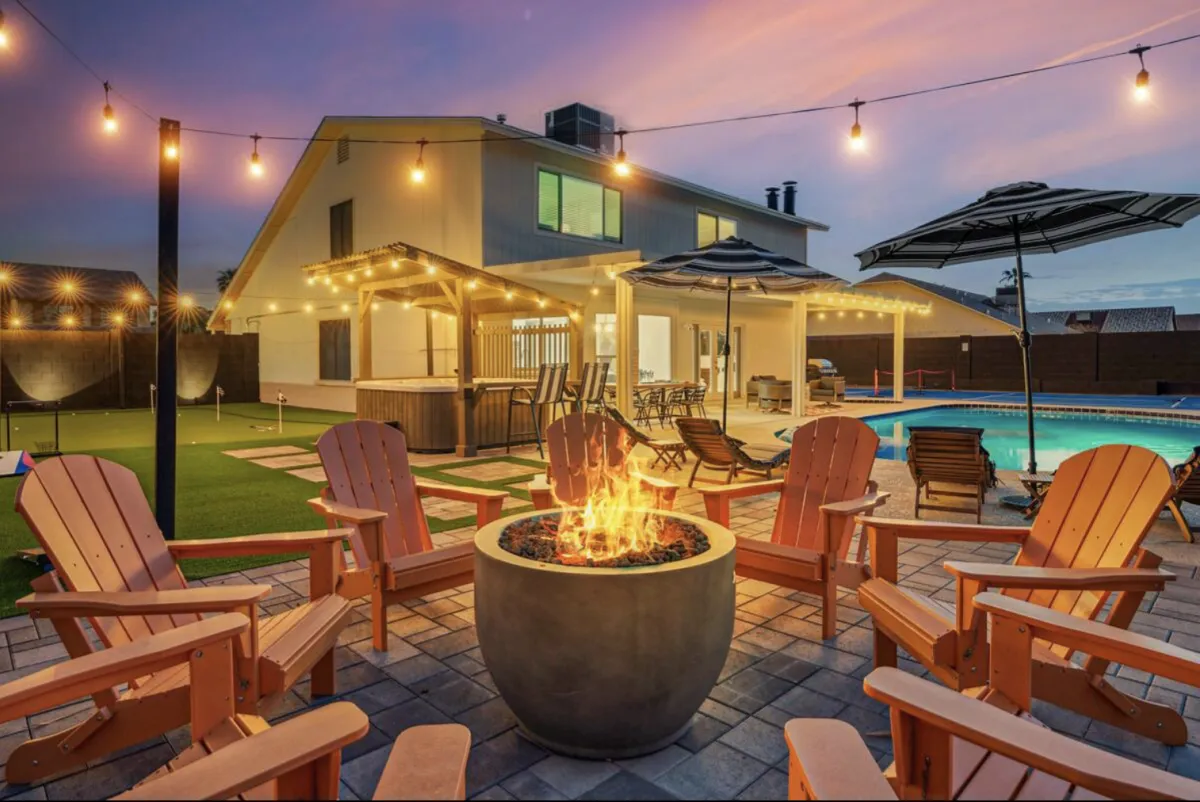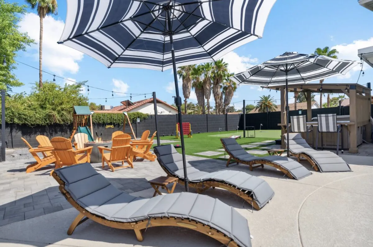 Cozy fire pit, BBQ grill, sun loungers, and shaded lounge space